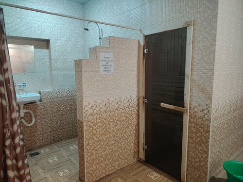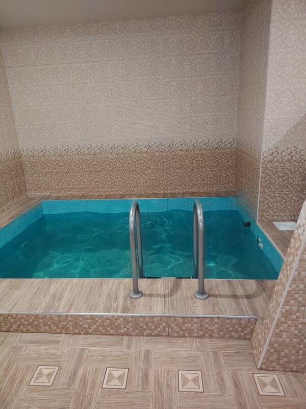 Парилка до 80 градусов электрическая, холодно, работает обогреватель, не спасает. Цена 1500 час. Бильярд, тв, душ, купель, парилка, комната отдыха с зеркалами по бокам и на потолке.