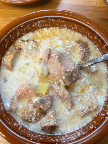 Легендарное место для всех путешественников по Карелии. Самая вкусный лоххикейто в моей жизни: наваристый, с огромными кусками рыбы, безумно вкусный и сытный. Сухари в супе, на мой взгляд, были лишние. Но вот рыба стала непомерно дорогой... понимаю, место туристическое, но это выше рынка и выше даже частников. Дизайн заведения – будто столовая начала нулевых. Мне кажется, что с таким потоком туристов можно обновить ремонтик: мигающий телевизор с программами по Россия-1, старые обои и устаревшие рекламы и шрифты немного портят общее впечатление от места. Но на уху обязательно еще вернемся!