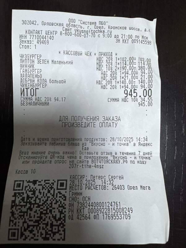 Имел честь посетить это заведение, были проездом. Часто в Москве бываю в заведениях бренда «вкусно и точка» и тут попадаю в Орле - я в шоке. Персонал: Петерс Сергей который принимал и выдавал заказы золотой сотрудник, таких надо беречь, все четко проговаривает и в конце уточняет.( дайте ему какую то премию и передайте от меня большое спасибо) На фуд-корте есть заведения которым бы такой персонал явно не помешал на прилавке. Видно что старается, прям чувствуется. Ну и всей смене тоже спасибо, булки были вкусные сочные, в Москве обычно мятые все и котлеты еле живые. Тут прям все свежее( есть с чем сравнить) Всем спасибо!
