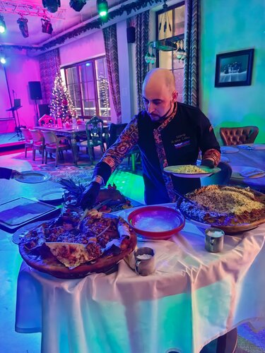 Были с женой увидели рекламу в социальных сетях и ожидание у сожалению разочеровало . Борщь по рецепту Ивлева сало как будто чихнул кто то . Две палочки хлебные совсем не понравились лепёшку поддали как раз к тому времени как в тарелке осталось пару ложек борща. Жене Хинкаль понравился. Каре игненка на мой вкус суховат. Может нам не повезло и у повара было плохое настроение .