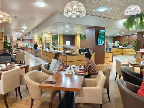 Хороший санаторий. Два корпуса объединены переходом, поэтому при посещении процедур или столовой не надо выходить на улицу. Есть спа бассейн с минеральной водой, можно просто расслабиться. Есть бассейн для плавания 25 метров, вода тоже минеральная 30°С. В столовой "шведский стол". Выбор блюд большой, не ограничивается, хотя каких-либо деликатесов не предлагается. За кофе в очереди стоять тоже не придётся, кофемашин хватает. Лечение нормальное, процедур хватило. Для прогулок на природе есть и территория вокруг санатория, и прогулочная дорожка (асфальт) вокруг озера. Понравилось то, что всё расписание процедур и посещение столовой находится в приложении на смартфоне. Персонал вежливый.