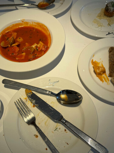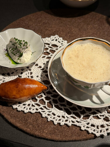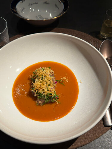 Впервые побывали в пространстве Chefs Table на Смоленской и попали на гастрономический сет «Суп всему голова» от шефа Глеба Шеломанова из White Rabbit Family Идея довольно необычная: весь ужин посвящён супам. В сете восемь подач — от «забытой» щучины с осетровой икрой и кальи со скумбрией до буйабеса, горохового супа с копчёным ребром и даже десертного супа с малиной. Формат камерный, больше похож на гастрономическое представление: каждую подачу подробно объясняют, рассказывают историю блюда и идею шефа. Интересно наблюдать, как привычный суп может выглядеть как полноценное авторское блюдо высокой кухни. Стоимость сета — 19 000 ₽ за человека. Формат точно не на каждый день, но как гастрономический опыт — очень любопытно, на сайте есть еще много вариаций ужинов и обедов — выбирай не хочу. Как подарок на день рождения или на свидание — вариант на 5+