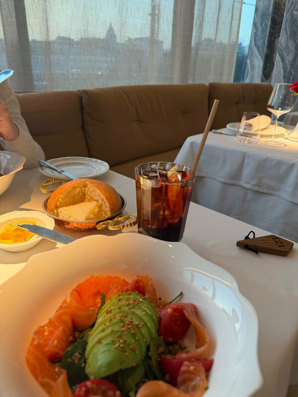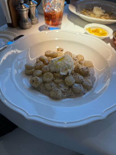 В рабочий день без брони свободно 25% столов, на втором этаже, в основном садят у окна. Подача в отличии от других кафешек сети Пинского быстрая, каждую позицию приносят через 10 минут. Каждый стол обслуживают в 2-а официанта, большие компании - 3. Рекомендую посетить на закате, очень уж красивый вид на Трубную и Бц Оружейный. Нам достался стол возле окна и открытой кухни, кухня не прибивала ни запахом ни шумом, а вот музыка была очень громкой. Все позиции из меню были вкусными, а «изюминки» блюд качественными(на горячем- свежая буррата, на десерте - сладкая голубика)