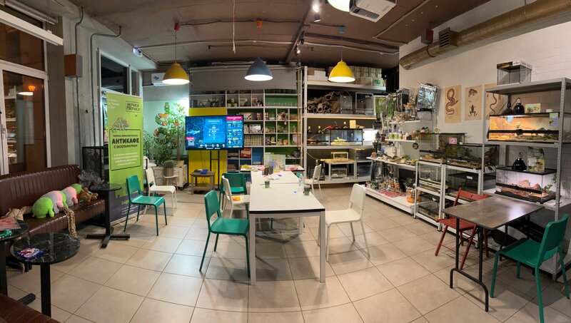 Мне кажется, это одно из лучших антикафе с животными в Москве! Просторное и уютное пространство, приглушенный свет, есть небольшой кафетерий, хорошая кофемашина и вкусняшки (вафли, пряники, печенье) — всё бесплатно. Показалось, здесь идеально отмечать дни рождения детей лет 7-9: есть пространство с видеоиграми и настолками. И, конечно, сами животные! Много дружелюбных насекомых и рептилий: за час мы потрогали палочников, тараканов и улиток, узнали, чем эублефары отличаются от бананоедов, а те от хамелеонов:) Подержали, погладили всех, даже сцинка и удава Кузю😁 Решили, что дома держать никого из них не готовы🤣 Отдельное спасибо нашему экскурсоводу: максимально приятный доброжелательный парень (не додумалась спросить имя)! Очень интересно рассказывал, удивил интересными фактами, давал деткам потрогать всех зверушек, отвечал на мои дурацкие вопросы! Будем рады при случае заглянуть к вам еще 🩷