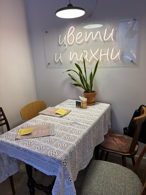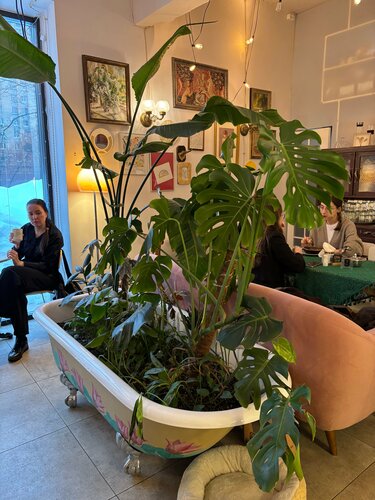 Как там говорят, ламповое местечко🫶 Это, пожалуй, самое подходящее слово. Уютнодушевноностальгическое кафе с этими торшерами, старыми книгами и кружевными скатерочками! Забавная ванна с растениями в центре зала. Комнаты крошечные, в пт-вс на вечер 100% необходима бронь столика. Мне очень понравились ребята-сотрудники: милейшие, приветливые, супердоброжелательные. То есть именно такие, какими они и должны быть🩷 Есть полноценная кухня, работает повар (ее видно в окошке:), мы только пили кофе с десертами, но без проблем можно хорошо пообедать (закуски, салаты, супы, горячее). Уверена, что все будет очень вкусно, потому что сладости — супер (особенно крут тарт с черносливом!) Заглянем еще, если будем рядом😊