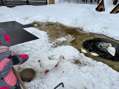 Сразу оговорка: домик не снимали, в баню не ходили, в ресторане полноценно не ели. Дочка большая любительница животных, а мы проводили выходные неподалеку. Заехали сюда по дороге выпить кофе (по словам мужа, очень средний) и покормить животных (привезли с собой яблоки и морковку). Основное, что хочу отметить: ОЧЕНЬ доброжелательный персонал! Абсолютно все были крайне приветливы: администратор по телефону (очень позитивно нас позвала заехать, посоветовала купить угощения итп, спасибо!), женщина-бармен, парень с ресепшен, который потратил свое время, отвел нас в клетку с енотами Маргошей и Платошей, чтобы мы могли их погладить и поиграться (ОСТОРОЖНО: еноты кусаются и довольно неприятно! Будьте очень аккуратны, заходя к ним с детками!). Помимо енотов, на территории отеля живут кролики (в том же вольере, очень милые и контактные), злобный фазан, красивые белые утки-гуси-лебеди, а также несколько классных лошадей, которые моментально съели наши яблоки:) Сразу бросается в глаза, что животные очень чистые, красивые, ухоженные, не худые! Если погода бы позволила, покатали бы ребенка на коне по территории (это стоит 1000 рублей, а часовая прогулка 4000). Есть на территории и пейнтбол (большая площадка), скорее всего, прокат и какие-то еще небольшие активности. Домики аккуратные, но не без минусов - слышно дорогу прям прилично и дома все стоят очень тесно друг к другу! НО веранда и мангальная зона обращены в сторону леса, так что внутри, думаю, неплохо. Оптимальный вариант приехать с компанией друзей или корпоративом с ночевкой: поиграть в пейнтбол, покататься на лошадях, устроить банкет в просторной беседке у пруда, попариться в баньке! Место НЕбюджетное, цены на еду и все остальное по нашим меркам очень высоки (тоже были в шоке от борща по 900 рублей в меню😁) Но при этом видно, что хозяевам не все равно (ухоженная и чистая территория, хорошо подобранный персонал, широкий спектр разных услуг). Желаем вам процветания!