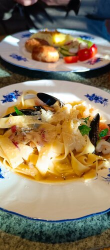 Судя по тому, что мы видели, место очень популярное. Как только приехала электричка, места моментально закончились. Кормят вкусно. На втором этаже ресторан, на первом - кулинария. Кофе, чай, хлеб, выпечка. Хлеб очень вкусный, кстати. Кофе тоже неплохой. Взяли ромовую бабу. Не пожалели. Сочная😊 еще и в стаканчике с кремом подается. Правда так и не поняли - есть в ней ром или нет 😁