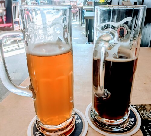 Отличный "пивной" ресторан с широким выбором блюд, приятной атмосферой и умеренными ценами. Пиво варят сами, так что оно у них всегда свежее. Минусов не нашёл, обязательно зайду как-нибудь ещё, чтоб попробовать ещё пару баварских сосисок, коих тут в изобилии.
