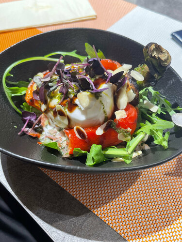 Из хорошего можно отметить, что это красивое, атмосферное место, очень приятная девушка нас встретила, вежливая, улыбчивая. Из минусов - работа поваров и еда, к ней вопросы есть. Из заказанного было: 1. Салат с розовыми помидорами, луком и салатом. Помидоров было два вида, черри и явно не очень розовые. Ладно, если это было бы единственной несостыковкой. 2. Печёный перец с бурратой в неудобной глубокой тарелке, фото ниже. Резать это неудобно, а об этом стоит думать, когда вы прорабатываете своё меню и подачу. Помимо этого, печёный перец был холодным… да, я понимаю, что на нём лежит холодная буррата, и по законам термодинамики мог снизить свою температуру. Но там не было не намёка на то, что он только что печёный только что и тёплый, хотя блюдо это предполагает. 3. Куриный суп с вермишелью. Пересоленный. Недосол на столе, пересол на спине. Доедать не захотелось. Впечатления смешанные.