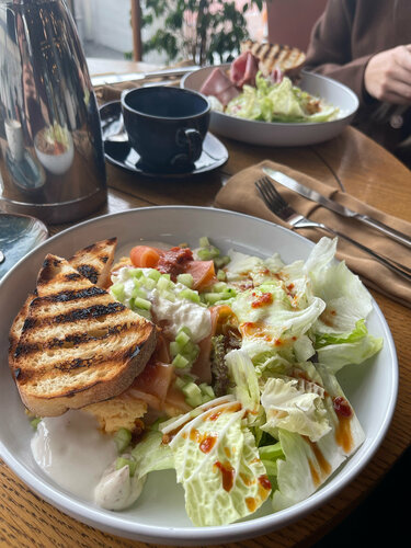 В этом месте каждая деталь, от интерьера до музыки, создает безупречное настроение. Даже если вы пришли без него. Заказали панкейки с вишней: сладость, от которой не оторваться, а не та, что вызывает жажду. Два скрэмбла - это настоящий фейерверк вкуса, что с лососем, что с мантеделией. Это уже не просто еда, а целый ритуал. Идеальным финалом стал чай с малиной и грушей, он сладкий, но этот штрих завершил картину, как последний аккорд в идеальной симфонии.