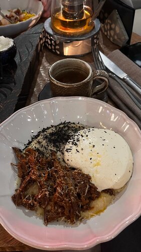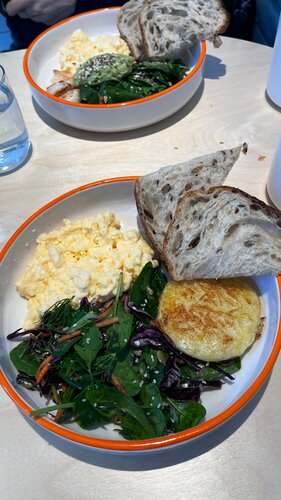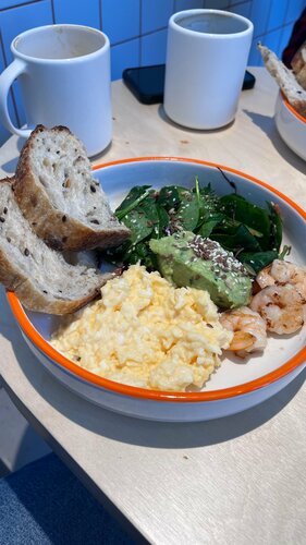 Хорошее место для завтраков. В будни завтраки до 14.00, а в выходные до 17.00 - идеально для меня :) Из минусов могу отметить: 1. Близкое расположение столов друг к другу 2. Громкая музыка, которая мешает разговаривать (наш стол располагался недалеко от колонок) Еда вкусная, но порции небольшие. Кофе тоже хороший, но не прям вау. Очень понравились оладьи из цукини - лучшие, что пробовали. Они скорее томленые, чем жареные. Не масленные вообще. И подаются с сыром, авокадо и яйцом пашот. Рекомендую попробовать! Персонал вежливый, но подача блюд не очень быстрая, хотя была не полная посадка