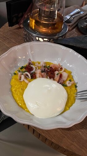 Красивый ресторан! Потрясающая атмосфера, вкусная еда. Именно за этим сюда и приходишь. Официант у нашего стола была отличная-по меню и составам блюд все смогла рассказать. Большой минус, что не было пасты с осьминогом (закончился осьминог), для ресторана это непростительно. Но оценку я снизила из-за плохого сервиса, вот прям дно! Официантов не хватает, ты очень долго ждешь, чтобы сделать заказ, потом очень долго ждешь комплементарный хлеб и сами блюда. Даже чай несли 20 минут. Особенно плохо, что на все столы не хватает стульчиков для сумок! Это я вообще впервые встречаю. Куда мы должны ставить сумки, на пол? Потом просто сами взяли у соседнего стола стульчик, когда он освободился. Счет тоже ждали 20 минут и 2 раза напоминали. Эти нюансы снизили впечатление от посещения По еде все понравилось Паста с рваной говядиной: 5/5. Отличное мясо и очень вкусно Ризотто с морепродуктами: 5/5. Вкусно, порция хорошая Мезе с лепешкой: 5/5. Все вкусно. Плохо что лепешек не хватило, а отдельно заказать нельзя. Но принесли еще порцию комплементарного хлеба Чай травяной: 5/5. Вкусный, заварки много, насыщенный вкус Впечатление испортил только сервис, для ресторана такого уровня это не приемлемо. Все остальное понравилось. Надеюсь руководство примет в работу мой комментарий