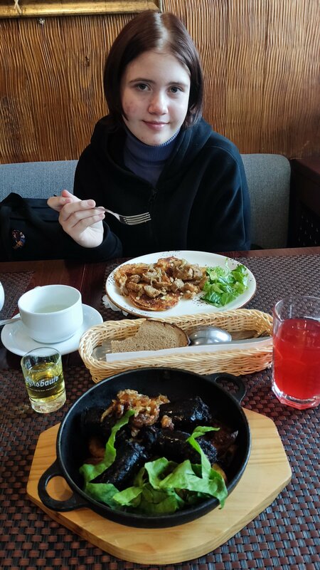 Обедали 01.01.25, как и многие по рекомендации гида. Щи и борщ очень наваристые, даже в грибных кислых щах было приличное количество мяса, в меру густые! Кто-то писал, что жидкие, - наверное перепутали с овощным рагу с мясом!))) Драники бомба, кровянка слов не подобрать, как бабушкина из детства, по классике с гречечкой и чесночком, зажарена то что надо! Морс чудесный, как я люблю, не концентрат вырви глаз и сахаром не испорчен, к Зубровке в самый раз!) Ценник не маленький, 3900 российскийми на двоих, но это того стоило, порции приличные и всё было очень вкусно, мяса не жалеют, выкатились сытыми довольными колобками!) Персонал согласна, не самый приветливый, но это и понятно 1го января почти все отдыхают, а они кормят толпы! Но никто же Вам не запрещает благодарно улыбнуться принимающему человеку, можно и комплимент сделать!) в этой Карчме точно откликаются на доброжелательность!) Сразу скажу за два первых новогодних дня в Беларуси нас сразу одарил приветливостью только один гид на сильно недешовой экскурсии! Ни проводники, ни продавцы, ни хостес, ни официанты, ни экскурсоводы не старались даже изобразить приветливость, прямо неприступные цитадели. Мы с дочкой устраивали импровизированные комплиментарные батлы))) Вернёмся в ресторан: дизайн вполне атмосферный, новогодние инсталляции были. Согласна с отзывами, пора хотя бы провести генеральную уборку, но в защиту заведения хочу отметить, что пока мы вкушали свою трапезу на первом этаже обнаглевшие гиды заводили толпы туристов на погреться с мороза и в туалет... Все понимаю, мы тоже с трёхчасовой экскурсии при -15 прибежали согреться, НО всё-таки пообедать. Настоятельная рекомендация к администрации заведения отрегулировать этот ньюанс, ну в самом деле, Вы же не придорожная заправка с кофе на вынос! А к посетителям "я только в туалет" огромная просьба закрывать за собой двери на улицу зимой и не нависать в верхней одежде над столиками, за которыми сидят посетители, пришедшие вкусно пообедать в приятной атмосфере в чудесном месте!