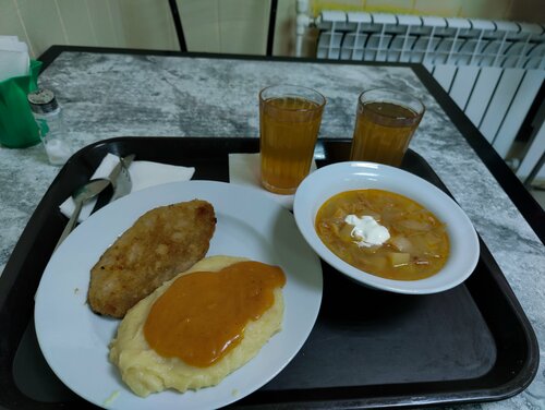 Очень давно хотел посетить разрекламированную коллегой сталовку. Т вот удача, специально еду сюда на обед. Нашёл без проблем, КПП открыт, вход виден. Рядом с КПП есть место для парковки. Без машины сюда наверное и не дайти. Внутри всё максимальной просто. Есть один умывальник. Касательно еду, брал обед, из которого понравилось лишь компот. Суп не насыщенный, на вкус мясо из консервы. Шницель на второе, оказался из какой-то серой массы ( наверное фарш, но цвет светлосерый немного напрягал). Пюре картофельное, явно не натуральное, либо сильно порошком разбавлено. Даже на вид это бросалось в глаза. Салат не брал, тк было то, что не люблю. Порции приличные, прям половина супа - оптимально! Рядом сидел человек, жаловался, что целая тарелка супа - очень много и нет сил больше есть. Атмосфера, вот что очень понравилось. Напомнило, в детстве в доме отдыха, приходишь, мама покупает ( делает заказ на бумажке), и с этой бумажкой идёшь получать еду. Итак, гештальт закрыт. Еды достачно, но она не самая вкусная, что ем на ланчах в разных местах.