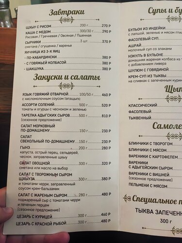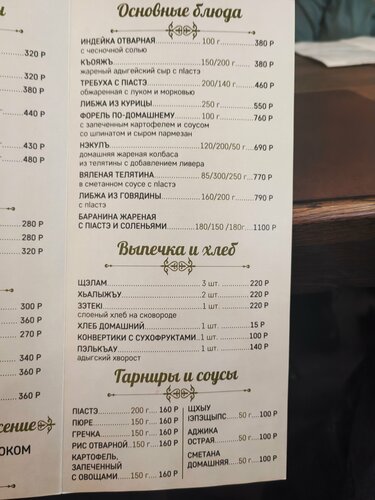 Ресторан с национальной адыгской кухней. Весьма интересное место, готовят вкусно и быстро. Меню достаточное на любой вкус. Порции меньше чем хотелось бы(но не критично). Об любом блюде вам расскажут подробно как оно готовится. Ребята, поставьте пару вешалок для одежды в зале. Некуда повесить верхнюю одежду. При входе два крючка, один из них сломан.