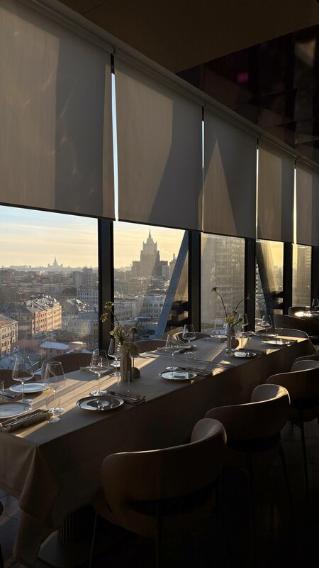 Очень приятное, стилизованное пространство, действительно притягательный панорамный вид на МИД России, Арбат, Кремль и Никитский бульвар. Залы очень светлые, чистые и эстетически приятные. Кухню оценили парой блюд, у меня был лосось - советую брать его с гарниром, поскольку блюдо очень маленькое, к нему нужно какое-нибудь дополнение. От ресторана была комплиментом свежая хлебная нарезка со взбитым маслом - потрясающе. Воду комплиментарно не предложили, изначально стол был засервирован со стаканами для холодных напитков - их просто убрали при нас. Во время посещения ресторана сложилось впечатление, что сотрудников больше, чем посетителей, невольно становишься свидетелем посторонних small talks сотрудников ресторана. Также официант (моё упущение, не помню его имени) не проявлял инициативу, чтобы познакомить с меню. Основной минус ресторана (и жилых помещений отеля, зоны ресепшн) - везде очень жарко. Выходишь на улицу с облегчением. Не знаю, в чём проблема настроить комфортным образом систему кондиционирования (фанкойлы). Ресторан с хорошим потенциалом, отличной локацией, но, имея столько конкурентов рядом, предлагать настолько маленькие порции за немалый ценник...Поэтому, наверное, в ресторане немноголюдно, а жаль. С Уважением, консьерж дизайн-отеля "СтандАрт", Александра. Москва.