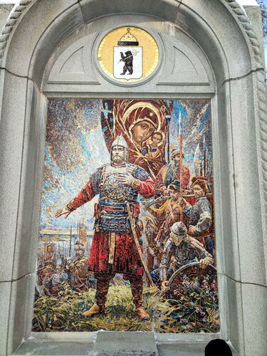 Красивая стела посвящена формированию Второго народного ополчения в Ярославле (1612 год) и молитве князя Пожарского перед освобождением Москвы. Основа образа: мозаичное панно Народного художника России Нестеренко.
