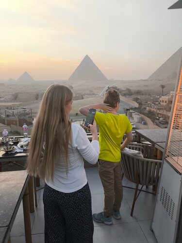 Прекрасный вид, персонал который готов всегда помочь. Был в этом отеле первый раз 5 лет назад и вот оказался снова. Отель устает все больше и больше и ничего не делается. Номер дали с окном над входом в отель - шум целый день. Завтраки - вареные яйца, овощи, булки, тушёные баклажаны, картофель фри, что то ещё было. Меню ооочень дорогое, банка колы 150 денег, на улице в кафешка по 25 брали. Ни о каких 4* и речи быть не может, максимум 2*. Отель нормальный, если рассматривать его, как 1-2*. Отличный вариант остановиться на 1-2 дня, что бы посетить пирамиды и музей.