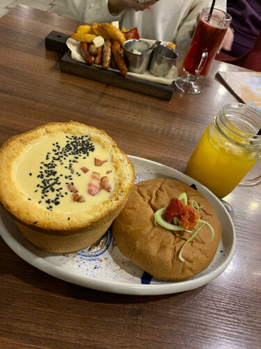 Семейное кафе, в которое можно прийти как с детьми (есть детская комната), так и в любой другой компании. Интересная подача, приятная атмосфера, огромный выбор блюд и напитков, меню включает детское меню с интересными вариантами подачи(ещё не видела нигде такого детского меню) И все это по относительно низким ценам Мы с подругой были приятно удивлены Рекомендуем☺️