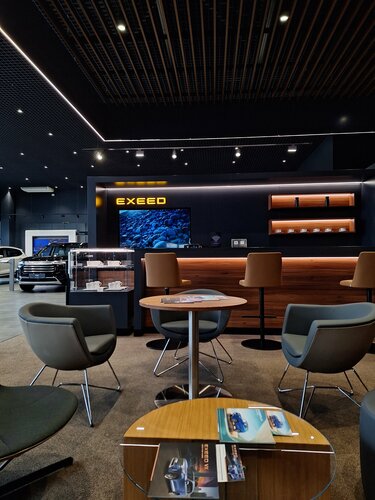 Замечательный, современный, и уже обновленный под стандарты 3,0 автосалон Exeed. Всё красиво и приятно, единственный минус — очень трудно записаться в сервис, так как очень много клиентов.