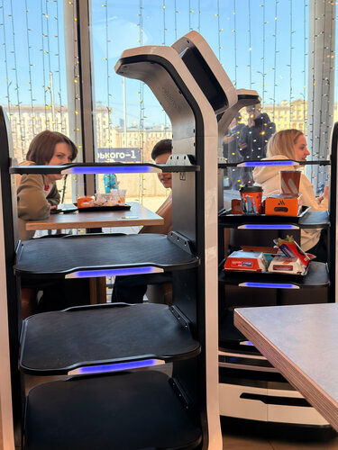 Никогда не думала, что заведение быстрого питания может быть таким долгим. Заказ на двух человек ждали более 35 минут (И ТО! нам не принесли наггетсы). Посадочных мест мало, летом точно будет не протолкнуться, ведь даже роботы-официанты не могут разъехаться в проходе. Очень маленькая площадь, выглядит даже смешно. Роботы забавные, но из-за них и вечно бегающих за ними детей тоже создается толкучка. Еду принесли ледяную, наггетсы, которые принесли позже из-за невнимательности были максимально пережарены… Фраппе по вкусу как сливки с сахаром, причем тонной сахара… Картошка была из-за температуры как вата. Плохо, очень плохо!