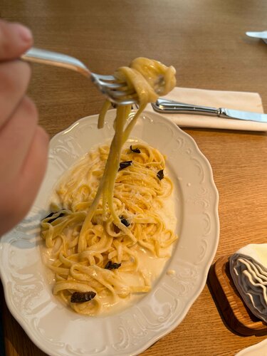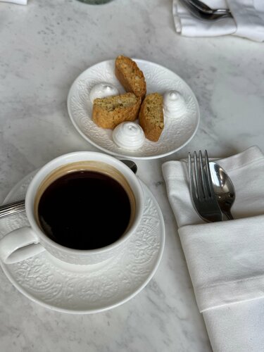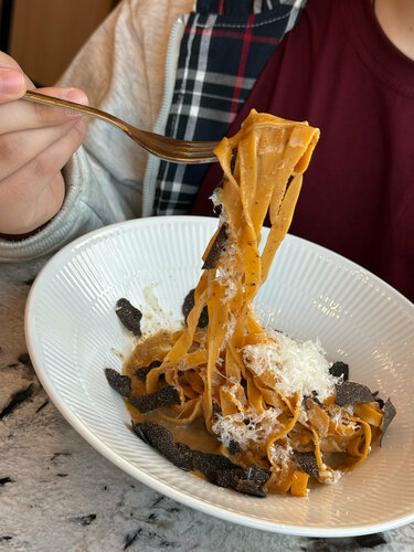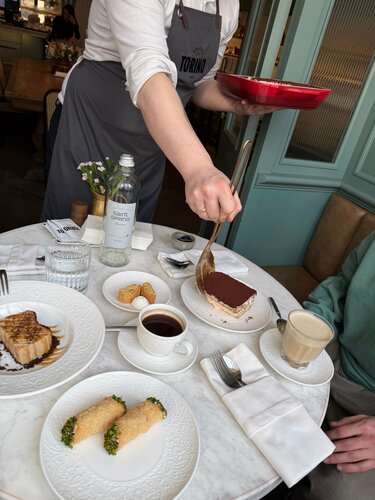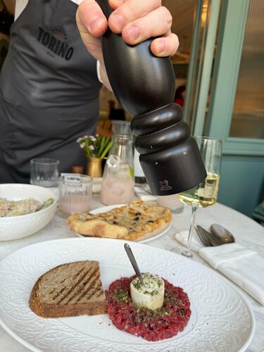 📚Водила детей в один из самых старых и любимых, читающими москвичами, книжный магазин «Библио-Глобус», что на Мясницкой. Это магазин моей юности, мы там проводили огромное количество времени, почти как в музее. Сейчас старший мой поймал тот же вайб, как раз, учась в Универе, поэтому передавала ему семейные традиции. 🍽️ Ну а после, конечно же, хочется обсудить и покупки и увиденное, а лучше всего это сделать во вкусном ресторанчике. Буквально за углом находится проверенное вкусное место - европейское бистро De Torino, вдохновлённое Турином и Пьемонтом. Место, где французская и итальянская гастрономические традиции встречаются в еде, интерьере и барной карте. Кухней бистро руководит Александр Ермаков, шефа знаю, очень уважаю, и поддерживаю уже расхожее мнение, что из-под его ножа выходят реально гастрономические шедевры. Вот тот случай, когда смело идешь на имя, и знаешь, что будет вкусно. Есть нюанс, в De Torino нереально вкусные и выгодные предложения «деловых обедов», и днём без брони сюда идти можно только на свой страх и риск, потому что аншлаг всегда! Но я была бы не настоящим фуди, если бы это не знала, и заблаговременно не забронировала себе совершенно роскошный столик, он как бы «кабинка» внутри зала. Такое место гарантирует шикарную трапезу в любое, даже самое людное время. Меню De Torino составлено так, чтобы можно было и быстро перекусить (блюда из раздела «Маленькие тарелки» придуманы специально, чтобы моментально появляться на столе и утолять острый голод), и основательно пообедать (фирменный бургер с копченым говяжьим ребром и чеддером или свиная корейка а-ля миланезе с тем самым копченым кетчупом тут как тут), и эстетски поужинать. И если пенне с мраморной говядиной  и соусом из трех видов перца – привет ностальгирующим по малой родине итало-американским домохозяйкам, то рецепт ризотто с кофе и уваренным до состояния карамелизованного соуса лагером  экспортирован прямиком с кухни одного из мишленовских ресторанчиков Пьемонта. Ну а раз символом Турина является бык, то в меню весьма кстати смотрится раздел со стейками, в том числе и сухого вызревания. Дети мои любители поесть, так что обед вышел основательным. На закуску взяли тар-тар с мозговой косточкой, салат романо с индейкой и соусом тонато, картошечку фри с трюфельным соусом, пинцетту с сыром и трюфелем. Эти позиции мы заказываем в стол из раза в раз, потому что они реально нереальные! Вот идеально приготовленная классика, которая улетает у нас минут за 5! На горячее старший взял суп каччуко с креветками, белой рыбой и кальмаром и фирменный Бургер с копченым говяжьим ребром, чеддером и домашним кетчупом. Бургер выглядит невероятно эффектно, подается прям с косточкой, которую, конечно, перед едой надо вынуть. Младший фанат стриплоина. Все гениальное просто: просто идеально приготовленный стейк. Я по овощам, здесь очень люблю артишоки. Шеф делает к ним шикарный соус. Завершили трапезу сладким столом, из десертов взяли тирамису «негрони», кофейный чизкейк и фирменные канноли. Настоящая Dolce Vita! Смешение французского с итальянским нашло отражение и в барной карте бистро. Шеф-бартендер Роман Морозов предлагает оч много интересного и изысканного, об этом лучше не писать, а сразу пробовать! Кстати, в De Torino с 12:00 до 00:00 в воскресенье и понедельник cocktail day — коктейли из раздела signature по 540₽