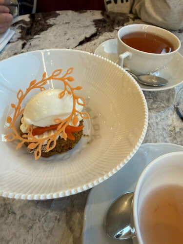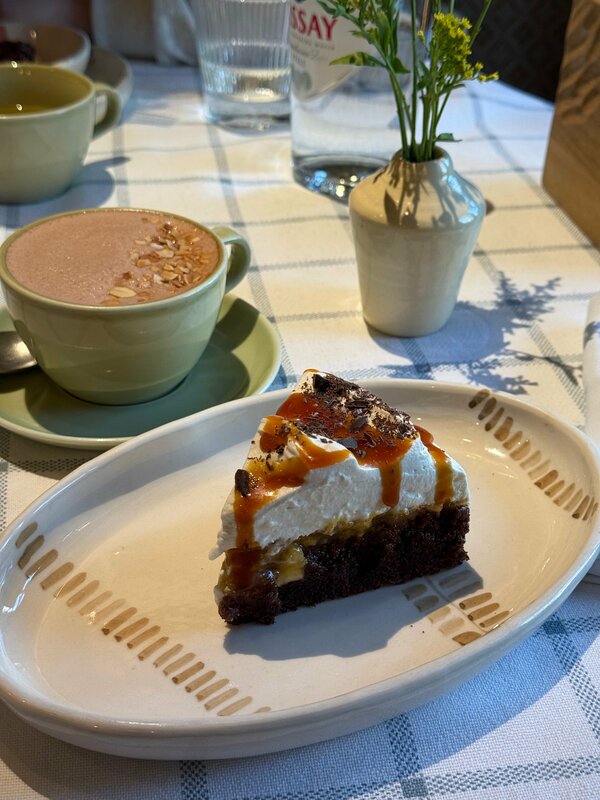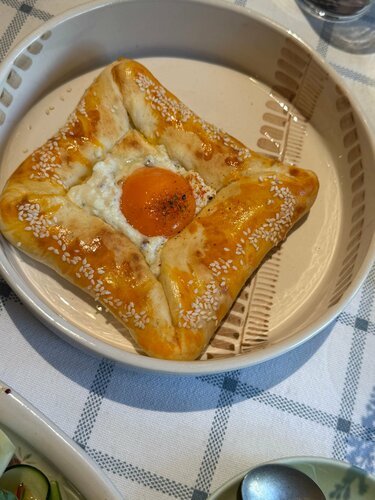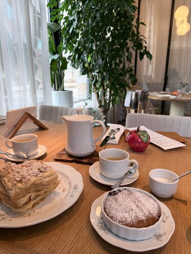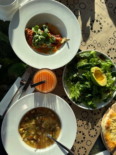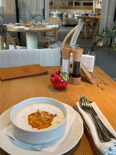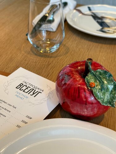 «Гастродача Вселуг» ресторан и лавка фермерских продуктов в районе Тульской. С рестораном познакомилась с самого его открытия, в 2023 году, и теперь частенько, когда гуляем, заходим сюда перекусить. Концепция понятная: своя ферма, на ней производят коровье, козье и овечье молоко, йогурты и кисломолочные продукты;  сыры; овощи, фрукты и ягоды, в том числе — дикорастущие; мясо и птицу; продукцию мясной гастрономии; кулинарию (полуфабрикаты, заморозка) по рецептам бренд-шефа и шеф-повара собственного ресторана. А так же из этих продуктов готовят и в самом ресторане. Естественно, такое свежее сырье, да в умелых руках шефа, превращается в очень вкусные блюда. Сейчас на кухне новый шеф – Антон Щеглов. Меню — понятное, но с интересными вкусами. А уж пока идет Великий Пост, то с таким количеством овощей и фруктов с собственной фермы меню получилось одним из самых широких в Москве (а мне можно верить, с начала поста каждый день пробую их в разных ресторанах) Очень понравилось карпаччо из свеклы с кремом из чернослива и кофе. Крем оч интересный, впервые пробую такой, со свеклой идеальное сочетание. Такое блюдо могла бы весь пост есть! Крем-суп из тыквы с чипсами из топинамбура и кокосовой пеной. Именно за счет этой пены вкус довольно сильно отличается от классического, получился сладковато-кокосовый привкус, сам супчик легкий, а хрустящие чипсы придают текстуры. И подача красивая, пена как облачко. Я хотела попробовать запеченный батат с трюфельной сметаной, но, к сожалению, он был в стопе. И как альтернативу нам предложили батат фри с трюфельным соусом. Да, блюдо не совсем постное, но, как я и говорила, я держу пост не супер строго, позволяю себе немножко сыра, поэтому батат тоже попробовала. приготовлен идеально! Кстати, про сыр. В лавке «Гастродачи Вселуг» он шикарный! Столько разных сортов производят на ферме, что устоять невозможно! Мы частенько именно за ним сюда приходим. А в ресторане в качестве комплемента подают сыр в медово-горчичной заправке, такая вкуснятина! И завершая постную трапезу, я взяла вишневый пирог со сметаной. Такой он с хрустящей корочкой, горяченький, аппетитный. Мой напарник мясоед по старой схеме взял тар-тарчик, пасту с трюфелем, домашние пирожочки (тут подают ассорти с капустой, уткой и грибами), свежих ежиков из аквариума, а на десерт огромный хрустящий Наполеон. Новый шеф готовит отлично! Будем продолжать приходить в «Гастродачу» на вкусные обеды! Кстати, у них еще отличный выбор вин, их идеально подбирают под блюда из фермерских продуктов, так что забежать на бокальчик сюда тоже оч приятно. Ну, а про интерьер писала уже не раз, но все равно, не устаю повторять, что здесь такая комфортная «природная» атмосфера, много зелени, дерева и натуральных текстур. Книжки на полках реально создают впечатление, что ты на даче. А фирменные подставные тарелочки с птичками и керамические овощные фигурки на столах вообще милашество!