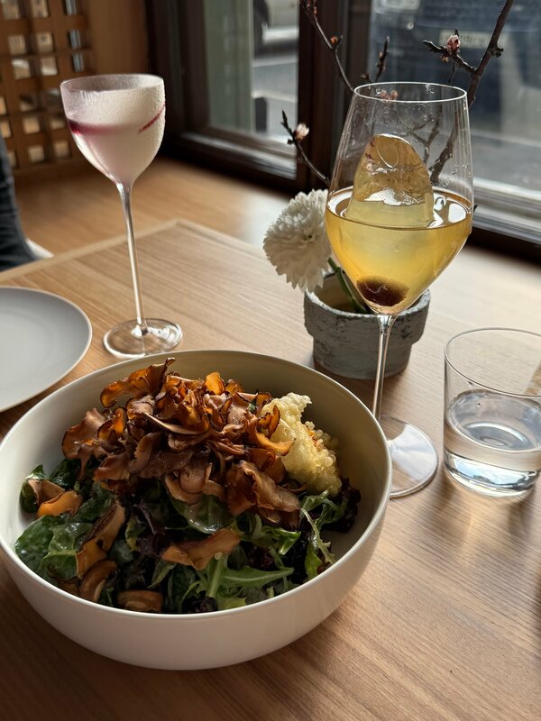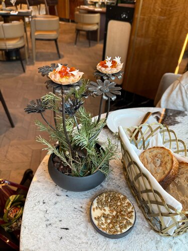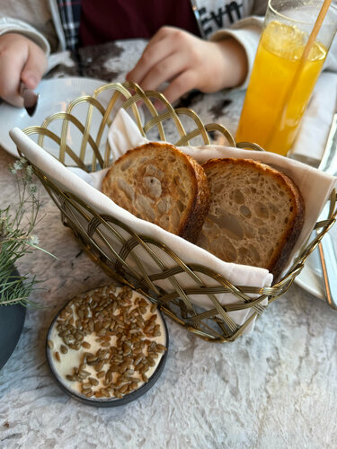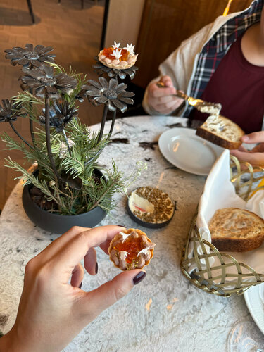 В ресторан «Поле» я не могла дойти с самого его открытия все два года! Всегда что-то случалось и визит переносился. Но упорство мое второе имя, я на полпути не сдаюсь, поэтому вчера туда дошла! Правда, с открытия, шеф там сменился и сейчас бренд-шефствует Алексей Волков, его знаем по кухне соседнего ресторана Lea, и в его мастерстве убедились не раз, так что шли на обед и знали, что точно будет вкусно. Кухня современная авторская, но и название и концепт дает понять, что акцент на натуральных продуктах. Комплементом приносят подставку в виде полевых цветов, с авторскими тарталеточками с паштетом и мармеладом (вроде из лука, но была настолько впечатлена подачей, что не запомнила). Закуска на зубок, во рту получилось оч вкусно! Так же комплементарный хлеб со взбитым маслом и семечками. Вот такие детали, на самом деле, решают, и сразу настраивают гостя на получение удовольствий и вообще прекрасное времяпрепровождение. Я, естественно, хотела попробовать постное меню. В этом году как-то особенно хочется, чтобы время Великого поста отозвалось светом, лёгкостью. Вкусы чувствуешь даже душой. В постном меню Поля делают акцент на самые значимые продукты средней полосы в преддверии весны — хурма и медовая тыква, еловая заправка и грибная похлёбка, гречка из печи с лесными грибами, вареники из печёного картофеля с чёрными лисичками, цветная капуста с кедровым пралине. Салат с хурмой и тыквой это очень необычное сочетание для меня! Но на вкус это так классно и интересно! Плюс выглядит он невероятно аппетитно, ярко, свежо. Стопроцентное попадание в мой вкус. Идеальная цветная капуста с кедровым пралине. Реально как десерт! Ее могла бы есть на завтрак/обед и ужин весь пост! Завершила трапезу черемуховым тортом с брусникой. Очень понравилось, что десерт совсем не сладкий, а горчинка от брусники придает пикантности. В сочетании с фирменными чаями это просто божественно! Кстати, в «Поле» отдельная чайная карта, это прям роскошно. Обожаю такие истории. В зале я увидела огромную печь, в ней готовят фирменные лепешки. На момент нашего визита, к сожалению, они были на стопе. Но это повод вернуться сюда ща ними снова. Об этих лепешках ходят легенды в фуд кругах. Мой бессменный напарник мясоед попробовал основное меню ресторана. Нам рассказали, что меню буквально на днях обновили, но так как мы и старое не пробовали, то для нас все позиции были не знакомыми, и с интересом изучали и их. В меню собрали всё, чем богата земля в эту пору: лесные травы, корнеплоды, первую зелень, дичь и рыбу. Для начала — тартар из сахалинского гребешка, где яблоко в масле трав встречает соус из крыжовника. Следом — скумбрия с ягодами можжевельника и крем из черемши: лесной дух, смолистый и терпкий, смягчённый сметаной. Особый гость — ямальский олень с пастернаком в двух ипостасях: чипсы и мороженое. На горячее — насыщенный луковый суп с утиным хамоном и галантин в лучших традициях охотничьей кухни: рулет из перепёлки с фуагра, калёная гречка с кремом из сладкого топинамбура и соус из красного вина. Свежий улов — пожарская котлета из щуки с картофельным пюре и огурцами собственного посола. Гребешки подаём во всей нежности весны: с кашей из пастернака и воздушным велюте из сморчков. В дополнение, прямо с огня — ароматная лепёшка со сморчками, трюфелем и сулугуни: тянется, пахнет грибами, дышит 