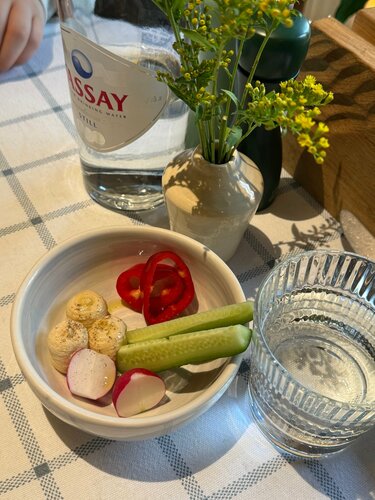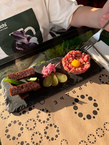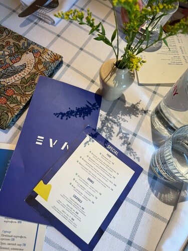 Должна признаться, к греческой кухне я довольно равнодушно отношусь. На мой вкус там не слишком интересная кухня и довольно ограниченный набор блюд, плюс особой фантазийности в Греции я не замечала. Теперь вношу правки в свою позицию. Мое мнение о кухне этого региона складывалось из приемов пищи непосредственно с Греции, на отдыхе, то есть без посещения каких-то изысканных ресторанов (уверена, они там есть, но меня как-то миновали), плюс пробовала разную Грецию в Москве, но она тоже была в основном комфорт-фуд, без претензий. И вот волею судеб я дошла в «модную» современную Грецию - ресторан “Eva”. Кто с гастрономическими взглядами более широкими, дошел туда раньше, а я только сейчас. Но, как говорится, лучше поздно, чем никогда; и еще как там говориться: не попробуешь, не узнаешь. Были в Eva в Хамовниках (с Большой Грузинской тоже сложнее, эта улица все еще слегка вызывает у меня интроверт-атаки, но я и над этим работаю). А Хамовники хорошо, как-то по-домашнему. Итак, первый шок - будний день, послеобеденное время, еще не ужин, но уже и не офисные ланч движения, а в Eve просто жизнь реально кипит, полный зал, все болтают, персонал гоняет по залу, сразу вспомнился фильм «Большая греческая свадьба». Думаю, признак хороший, раз люди так активно сюда идут. Уже и настрой на греческую кухню более лояльный. Пока шла к столику увидела открытую кухню, очень много свежих овощей, на столах у людей яркие аппетитные блюда. Все это прям вдохновляло. Интерьер средиземноморский, тоже необычно в историческом центре Москвы, когда вокруг песочного цвета фасады зданий и все такое выдержанное, внутри белоснежные скатерти и салфетки с лазурными клетками, полосками, зелень, яркие живые разноцветные картины, меню, обшитые узорчатой тканью. Настроение отпуска! Публика разношерстная, но все очень приличные, аккуратные, не пафосно-вычурные, прям приятная компания для обеда. Конечно же, я решила пробовать постное меню. Пока ждали заказ комплемент от заведения свежие огурчики, перчик, редис с хумусом. Оч классно вписалось в постную историю. Я заказала цукини с красным апельсином и фундуком. Такой модерновый салатик, свежие хрустящие ингредиенты, много разной зелени, базилик, мята, придающей интересный вкус не самому сложному блюду. А еще я поняла, почему не оч люблю греческую кухню, в ней очень часто используется греческий йогурт и он такой с кислицой, её то я и не люблю. Так вот тут ни в одном блюде я не встретила этого йогурта или заправки на его основе, и это прям мой кайф. Дальше заказала фаршированные томаты и баклажан на гриле. Там, кстати, была сметановидная заправка, но совсем не та греческая кислятина, которой я боялась. Помидорчики реально вкусненько нафаршированы, как обычно делают с перчиками. И очень удачный вкус дымка от приготовления на гриле. Кстати, в зале на открытой кухне стоит настоящая дровяная печь, и, конечно, это решает! Ну и на десерт я взяла шоколадный торт с бананами и карамелью из постного меню. Меня предупреждали быть с ним аккуратнее, он вызывает зависимость… так и случилось! Потрясающе вкусный десерт, теперь за ним придется возвращаться) Мой напарник не изменяет себе, взял тартар. Тут его подают с интересным греческим соусом и обилием томатов. Интересная современная греческая интерпретация классики. Еще заказал лепешку с сыром и желтком. Такая гречес