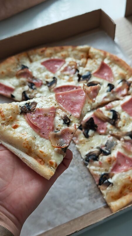 Заказала на самовывоз пиццу с ветчиной беконом и грибами. Нам с сыном понравилась, вкусная. Цена адекватная. Понравилось, что тесто тонкое и мягкое.