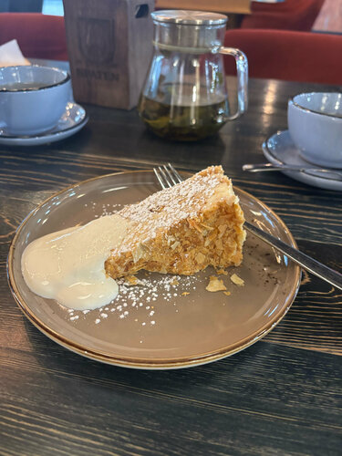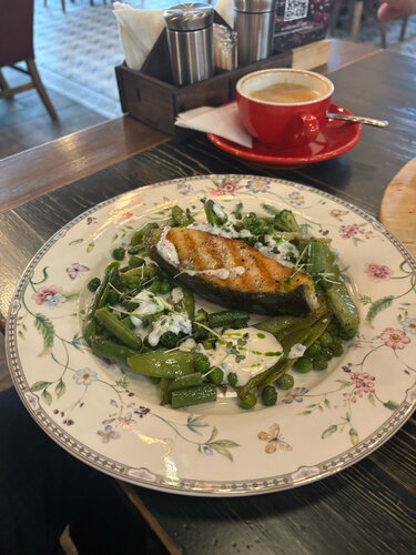 Завтрак на троечку. Интересный интерьер, вид на Фонтанку, но равнодушное очень очень медленное обслуживание и невкусная еда. Блины креп сюзет оставили только кусочек попробовали, всё понятно. Толстые, кислые, никакие. Даже человек который не ел их вкусными, поймет что всё пошло как говорится не так. В кише теста половина и половина начинки, если бы не запивала, то проглатывалось бы совсем тяжко. Яйцо на тосте, эх, хлеб был уже с прошлой недели наверное, дубовый, как и бриошь в хлебной корзинке, соус неоднородный. Джем горчил. Вообще у повара видимо день не задался, всякое бывает конечно. Не знаю за что зацепиться даже, у нас было хорошее настроение и в целом таким и осталось, но вернуться не захочется.