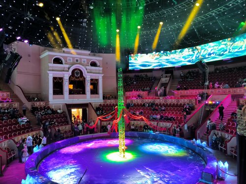 В новогодние праздники были на представлении. Очень понравилось! И само здание и представление. Много животных, акробаты, воздушные гимнасты, канатоходцы. Прекрасные костюмы, в паузах между номерами, зрителей всегда занимали клоуны