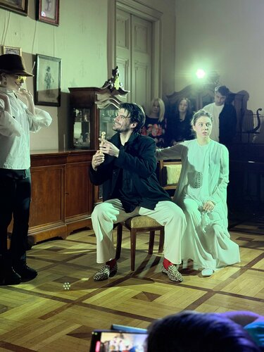 Была на показе иммерсивного «Гамлет. Иллюзии» в постановке Ильдара Аллабирдина — проект Московского драматического театра им. С. А. Есенина. Историческое пространство стало полноправным соавтором: зрителей вели из комнаты в комнату, и каждый зал раскрывал новый слой истории. Иммерсивная форма стирает дистанцию — свет, звук и пространство работают как единый механизм, усиливая душевные раны персонажей; актёрская игра правдива и прожита: Ярослав Шевалдов (Клавдий) обаятелен и тревожен, Дмитрий Мацко (Гамлет) отдаёт сцене внутреннюю напряжённость и уязвимость, сцены с Офелией особенно трогательны. Режиссура удачно балансирует между трагическим и комическим — спектакль остаётся с тихой, но сильной тревогой и действительно переживается всей кожей.