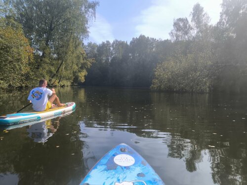 Моё самое любимое место для занятий на Сапе! В этот раз повезло и я была на занятии одна с инструктором! Никита всё подробно объясняет, если что-то не понимаешь или не получается, помогает) Этот заплыв был очень умиротворяющим, было очень тихо, мы не встретили ни одной лодки, было ощущение, будто плывёшь в диких безлюдных местах) вокруг меня летали несколько видов стрекоз, одна огромная так долго меня разглядывала, что почти врезалась мне в лицо))) над лесом кружило целое семейство соколов, а недалеко от нас летали две цапли!!! По воде весело бегали десятки водомерок, а один раз мимо проплыл ужик! А на живописность берегов я вообще не могла налюбоваться) Так что если захочется отдохнуть от суеты и города, это идеальное место)!