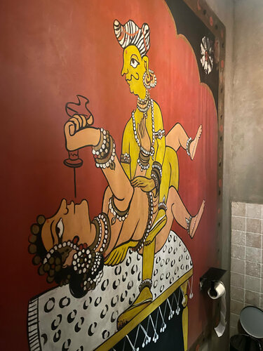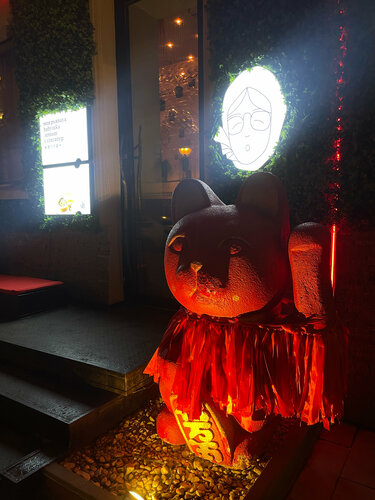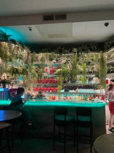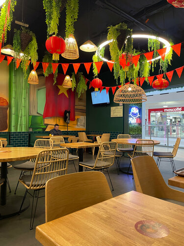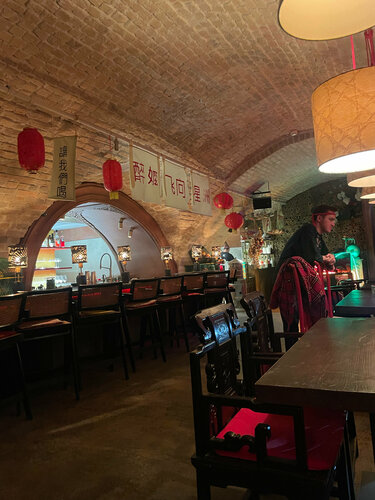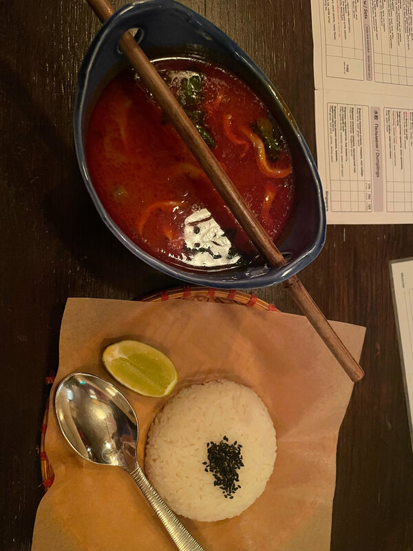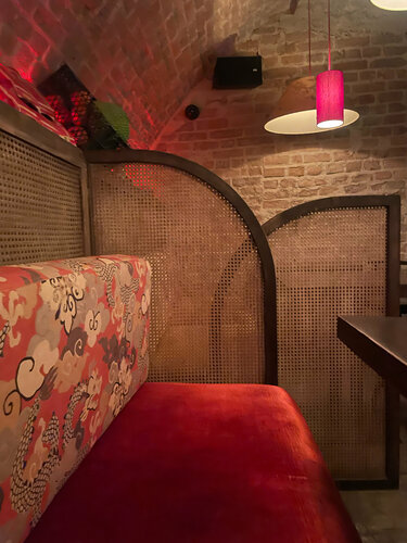В воскресный вечер было немноголюдно, за столиками девушки-подруги, решившие закончить вечер аперитивами и коктейлями. Ну а я после долгой прогулки забежала на быстрый перекус. Интерьер очень интересный, собственно именно из-за него и осталась, когда заглянула. Верхний зал с классическими столиками и нижний цокольный зал без окон, с кухней и приятными диванчиками, разделенными ширмой от других (классная идея) Сам формат заведения больше про бар, очень большое алкогольное меню, но по выбору еды тоже достаточно позиций. Решила оценить Том-ям. Интересная подача в необычной чаше. Сам бульон обжигающе горячий , наваристый, в составе достаточно морепродуктов :около 3 средних креветок, 3 мидии , кальмары и вешенки. Подается с жасминовым рисом. Кокосовое молоко в суп добавляется отдельно по запросу. На вкус приятный, наваристый, хорошая порция. Похож чем-то на том-ям, который продается в ресторане Шиба, но здесь порция раза в 2 побольше и цена приятнее. Мне понравилось и обслуживание; вежливое, быстро принесли. Единственное замечание, липкое меню😕 возможно потому что выходные проходят здесь ярко