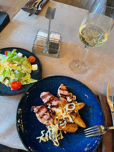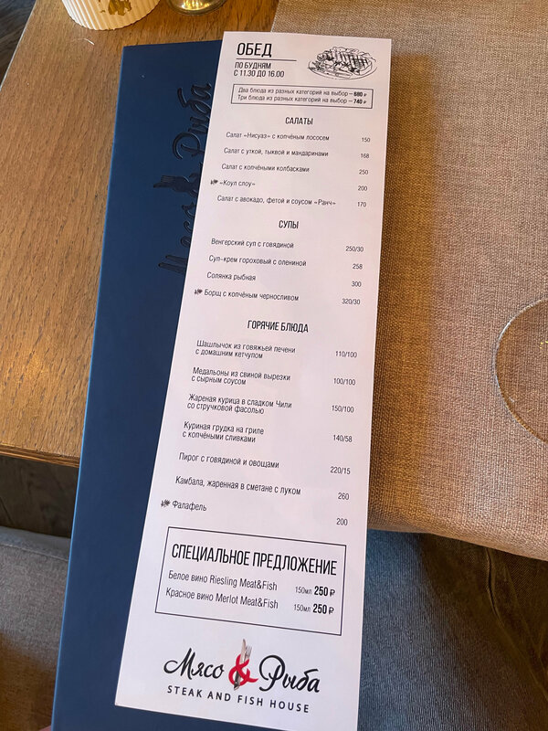 Мои любимые ланчи в Мясо&Рыба. Именно в данной локации сети, на Тверской, посещаю впервые. В целом понравилось, что 2 отдельных зала это даже плюс, не так шумно, как в Афимолле. Очереди на ланч не было, даже было достаточно свободных мест. Заказывала из позиций ланча : салат из авокадо и фета, стейк из свинины и бокал вина. Единственное, в салате попались помидорки немного помятые и крошка из кукурузных чипс в салате вызывают скрежет на зубах, да, они гурмански оттеняют вкус, но ощущения на зубах жестких чипсов в мягких салатных листьях все портит. Но ,в целом, люблю данную сеть, поэтому это для меня мелочи. Очень также выручает «переносная зарядка»