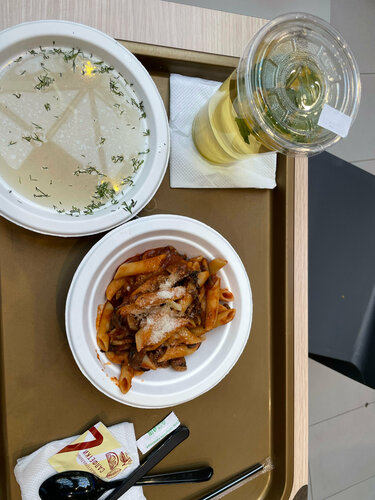 Яркая вывеска привлекла. Вкусный сытный ланч в формате конструктора! Который состоит из супа (сырный или куриный), второе - это паста (спагетти или Пенне , приготовленной в сырной голове или с томатным соусом», и лимонад ! Получилось всего 620р (тк добавила допом шампиньоны в пасту Приготовлено вкусно, чувствуются качественные ингредиенты , специи. Единственное, подача не моментальное. Ждала минут 15-18 Но в целом, понравилось, рекомендую