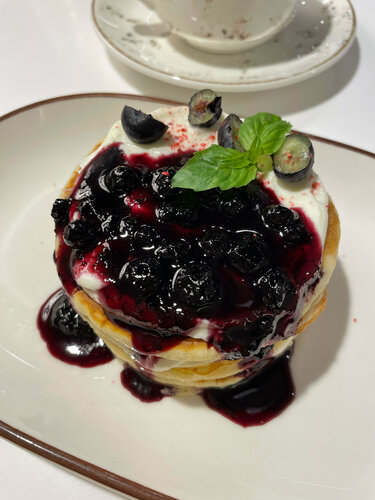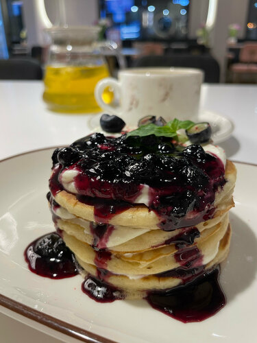 Панкейк черничный в сети очень вкусный 😋 ради него и заходим ) Отличная сеть с вкусной едой Приятная атмосфера и обслуживание
