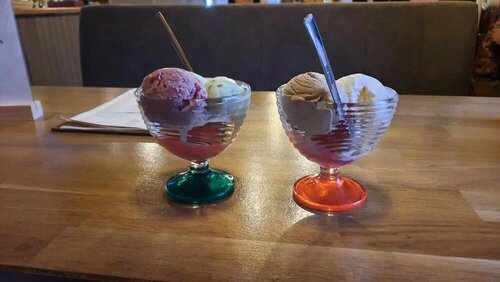 Ели мороженое, вкусное!!! Фисташка, смородина и малина очень вкусно!!! Шарик 65-85₽. Вполне демократичная цена для кафе))) персонал приятный. Уютное место посидеть, поболтать. Большой зал позволяет, народу немного даже вечером в предпраздничные пятницу. Сменились хозяева и названия,но париться не стали. Перемен особых нет. Латте 300мл с сиропом стоит 229₽. Красивый листик на пенке. Не понравился запах рыбы в зале. Есть красивые печеньки и выпечка, правда цены... Кому как. Еду не брали, может быть и вкусно. Люди в очереди брали заказы обедов с собой, наверно вкусно.