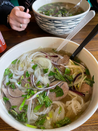 Цены на картах немного несоответствуют. Неплохое место, посадочных мест немного. Фобо классический, литр 600р, порции не делят, есть и меньший объем 600мл за 550р. Вместо лайма подают лимон, ростки свежие хрустящие, мясо чуть 🤏 с прожилкой (мягкое). Столовые приборы одноразовый пластик.