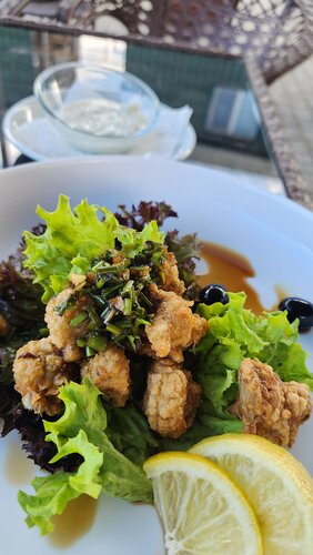 Шла с Боро-боро, искала именно рапаны. На набережной нигде не понравилось – шумно, накурено, долго ждать. А здесь никого не было, сидела одна, с видом на Кара-Даг. Принесли пледик, было ветрено. Брала рапаны в кляре и салат по типу греческого. Было вкусно, рапаны немного передержали, жестковатые вышли. Мне не критично, не ресторан, поэтому без претензий. В остальном всё хорошо – вкусно, вежливо и уютно.