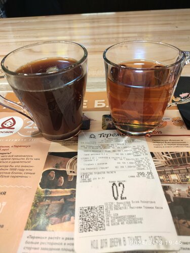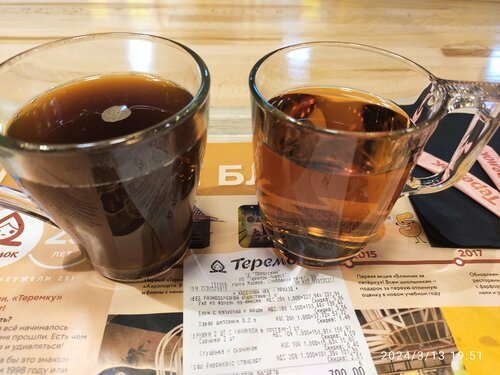 Иногда захожу в этот Теремок поесть блинов и съесть горячего супа. Всё вкусно, но кофе отвратительный! Дважды заказывал и оба раза вот такой "напиток" мне подали (см на фото и попробуй отличить, где кофе, а где узвар из шиповника?). Не рекомендую здесь заказывать кофе! В остальном, всё приемлемо.