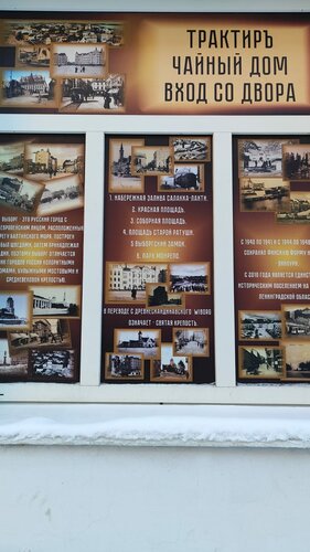 Прекрасное, уютное и милое место, находящееся в старой части Выборга, на ул. Крепостной. При входе вас встретят красивым интерьером с императорской мебелью и таким же вниманием и почтением! При заказе борща, вам подадут комплимент из ароматных сушек и крендельков. Екатерининский чай, поданный в оригинальном чайнике, порадует вас изысканным вкусом трав, ягод и прекрасного цейлонского чая. А если вы пришли в Чайный дом "Выборгский" с мороза и вам улыбнулась хозяйка, то ваш вечер пройдет в незабываемой атмосфере скандинавского гостеприимства! Рекомендую к обязательному посещению))