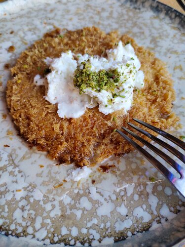 Зашли совершенно случайно во время прогулки. Очень любим израильский стрит-фуд, поэтому захотели попробовать и в этом месте. Заказывали кофе по-иерусалимски, сабих и кнафи. Бонусом нам принесли безумно вкусную пахлаву, но её я, по рассеянности, не сфотографировала. 1. Кофе. Абсолютно великолепный, не восточной крепости (за счёт молока), с явственно чувствующимся кардамоном и не просто молочным, а сливочным вкусом. 2. Сабих. На моей памяти, конечно, сабих - это всё же печёные баклажаны, яйцо (здесь не добавили, и это скорее плюс), салат кацуц, амба и тахини (по крайней мере, такой я ела в Нетании и Тель-Авиве), но на фалафель, добавленный в состав, реагирую крайне положительно. Фалафель просто великолепный, хрустящая корочка и нежнейшее содержимое, просто нутовая паста с зеленью, ещё горячий! Очень вкусный соус, точное попадание и во вкус, и в текстуру, отличный салат (рядом с горячим содержимым листья остались хрустящими, помидоры и огурцы - прохладными, и добавлены соленые огурцы), но главная звезда - сам баклажан. Нежнейший крем с насыщенным вкусом и без капли жира! 3. Кнафи. В меню указано именно так, но мне кажется, что в русском языке принята транслитерация кнафе, и, кажется, это ливанское или палестинское. В любом случае, это восхитительно: тонкая корочка теста кадаиф и мягчайший сыр, пропитанные сахарным сиропом, но это не приторно (как раз за счёт солоноватого сыра). Подаётся с мороженым и фисташковой крошкой. 4. Пахлава. Пахлава нас покорила. Очаровательный крохотный квадратик потрясающе вкусной пахлавы, будто только с восточного базара (когда покупаешь её едва остывшей), поданный с маскарпоне. 5. Самое главное: сервис. Блюда подаются чуть ли не со скоростью света, идеальной температуры, безумно красиво (очень интересная посуда!), но особенно хочется отметить работу команды. Официанты чуть ли не бегают по залу, всегда готовы и принять заказ, и убрать стол (только посетители ушли, столик уже убирают), интересуются мнением посетителей. Придём ещё🖤