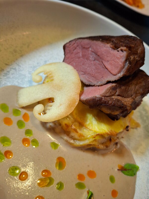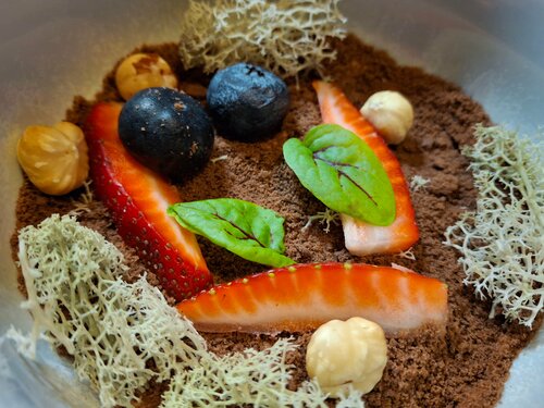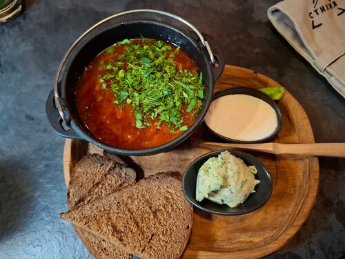 Посетили ресторан вечером, добирались на такси. Когда нас высадили, сначала вообще было непонятно, куда идти — ориентиров почти нет. Уже потом заметили, что вход где-то внизу, в подвале, и по вывеске на здании нашли нужное место. Немного квест на входе получился. Интерьер и атмосфера Внутри всё выглядит довольно необычно и интересно: водопадики, проекторы с разными фонами, декоративные элементы, мох, оформление потолка — видно, что старались сделать атмосферно. Помещение просторное, но при этом не хватает зонирования. Сидишь в общем зале, все друг друга видят, и ощущения уединённости нет. Иногда ловишь себя на том, что вместо своего ужина наблюдаешь за чужими блюдами и начинаешь хотеть ещё. Посадка и обслуживание Есть гардероб, стол был забронирован, но загрузка зала на момент посещения была небольшой. Обслуживание в целом хорошее: за столом следят, посуду убирают вовремя. Но был неприятный момент: попросил просто стакан воды, чтобы запить таблетку — предложили только покупную бутилированную. Ситуация, честно говоря, странная. Пришлось идти в туалет и запивать из-под крана. Это тот случай, когда мелочь сильно портит общее впечатление. Меню и подача Меню не очень большое, но позиции интересные. Готовят достаточно быстро. Отдельно отмечу момент с сервировкой: на столе изначально стоит лишняя посуда, которую потом начинают убирать. Не самый понятный подход — выглядит лишним действием без особого смысла. Еда Борщ с черносливом — вкус очень интересный и насыщенный, сам по себе блюдо отличное. Но подача с луком и салом, на мой взгляд, перегружает вкус. Сам борщ яркий, с лёгкой сладостью, и дополнительные ингредиенты скорее отвлекают, чем дополняют. Филе миньон с картофельной подушкой: картофель нарезан тонкими ломтиками, по краям получился хрустящий, а внутри — скорее аль денте, что выглядит немного спорно. Само мясо — два плотных куска, текстура очень нежная, даже неожиданно, больше похоже на мягкую однородную структуру, чем на привычное волокнистое мясо. Интересно, но не всем может зайти. Коктейль — нормальный, без сюрпризов, подача аккуратная. Единственное — две тонкие трубочки вместо одной обычной выглядят скорее как дизайнерское решение ради дизайна. Планировка и детали Помещение показалось немного запутанным — возвращаясь из туалета, легко задуматься, туда ли идёшь. Сам туалет оформлен красиво, но детали подкачали: вместо ожидаемых текстильных полотенец — бумажные, да ещё и с не самой удобной системой. Ведро с педалью тоже живёт своей жизнью. Вроде мелочи, но на фоне общего уровня заведения они бросаются в глаза. Итог Счёт на двоих вышел около 4500. Место интересное, с хорошей идеей и вкусной кухней, но с рядом странных решений и недоработок в деталях. Впечатления остались смешанные: есть за что похвалить, но и поводов задуматься достаточно. В итоге — 3 звезды. Честно говоря, хотелось поставить меньше, но с учётом кухни и атмосферы остановился на такой оценке.